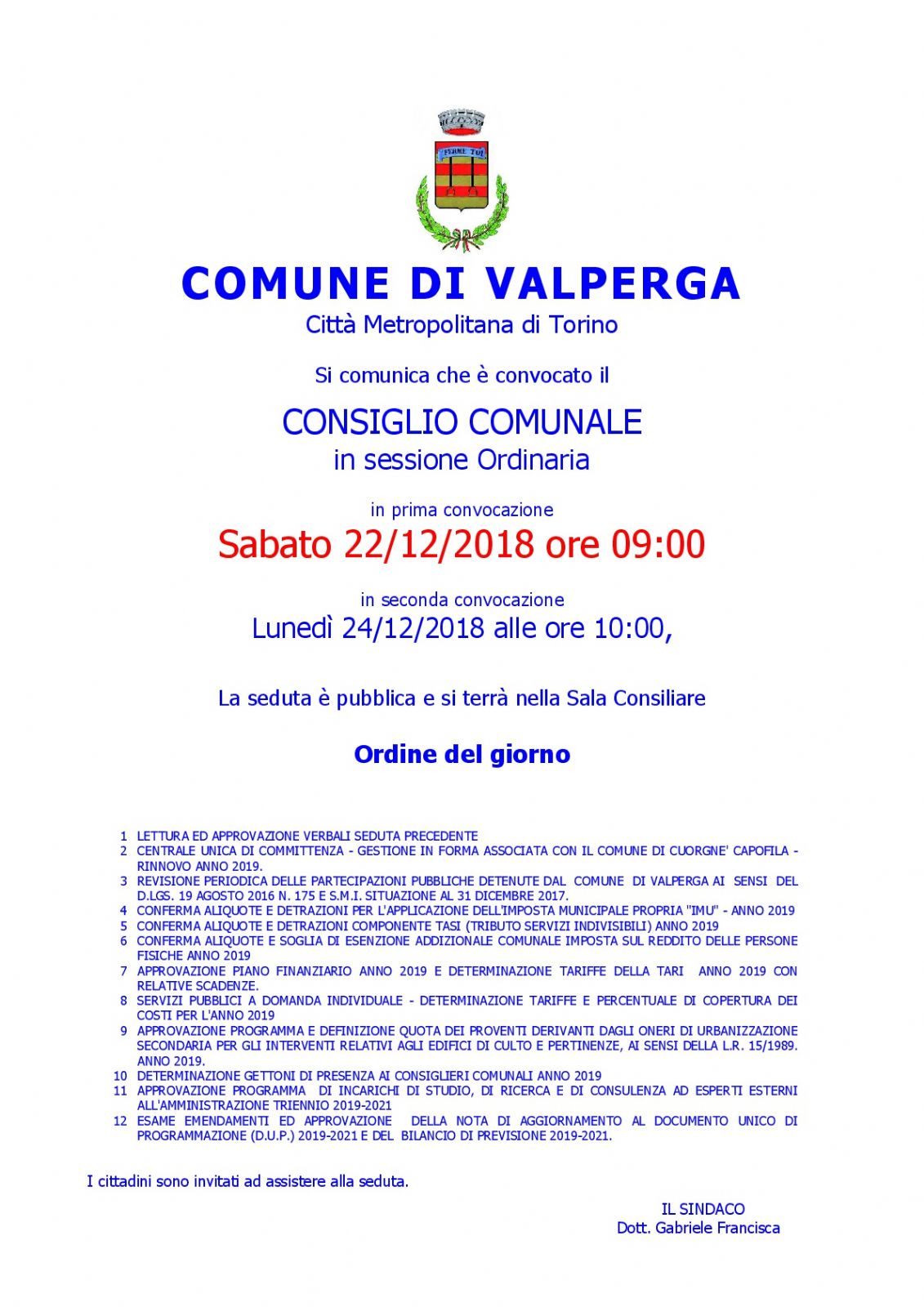 SABATO 22 DICEMBRE 2018 ORE 09,00 E' CONVOCATO IL CONSIGLIO COMUNALE IN SEDUTA PUBBLICA - SESSIONE ORDINARIA