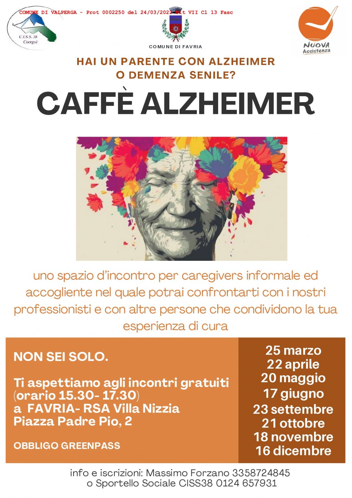 NON SEI SOLO. Ti aspettiamo agli incontri gratuiti (orario 15.30- 17.30) a FAVRIA- RSA Villa Nizzia Piazza Padre Pio, 2. Obbligo greenpass. Date: 25 marzo, 22 aprile, 20 maggio, 17 giugno, 23 settembre, 21 ottobre, 18 novembre, 16 dicembre
