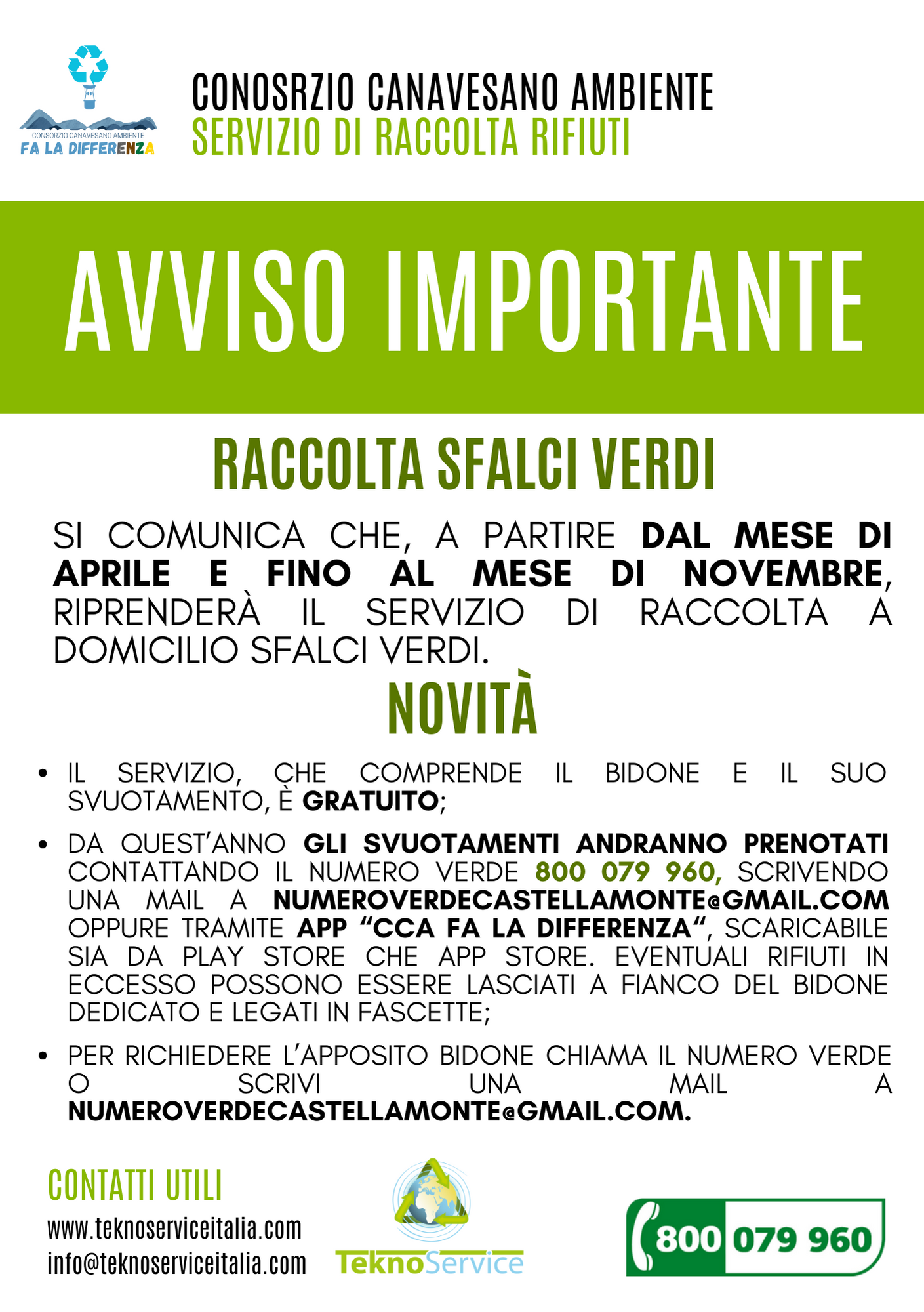 Il servizio rimane gratuito. Gli svuotamenti andranno prenotati contattando il numero verde 800079960, via mail all'indirizzo di posta elettronica "numeroverdecastellamonte@gmail.com" oppure tramite app "CCA fa la differenza", scaricabile sia da play store che da app store