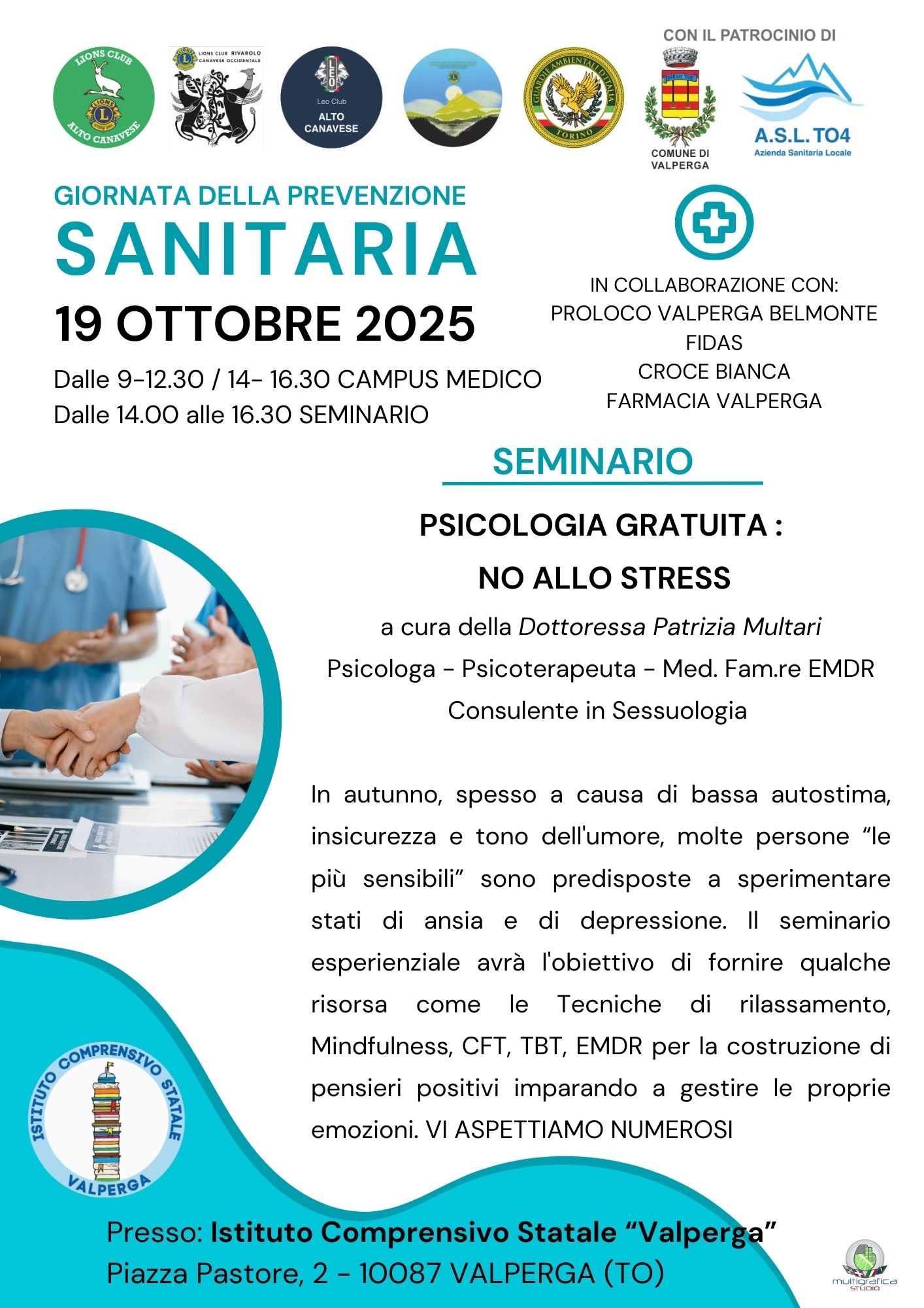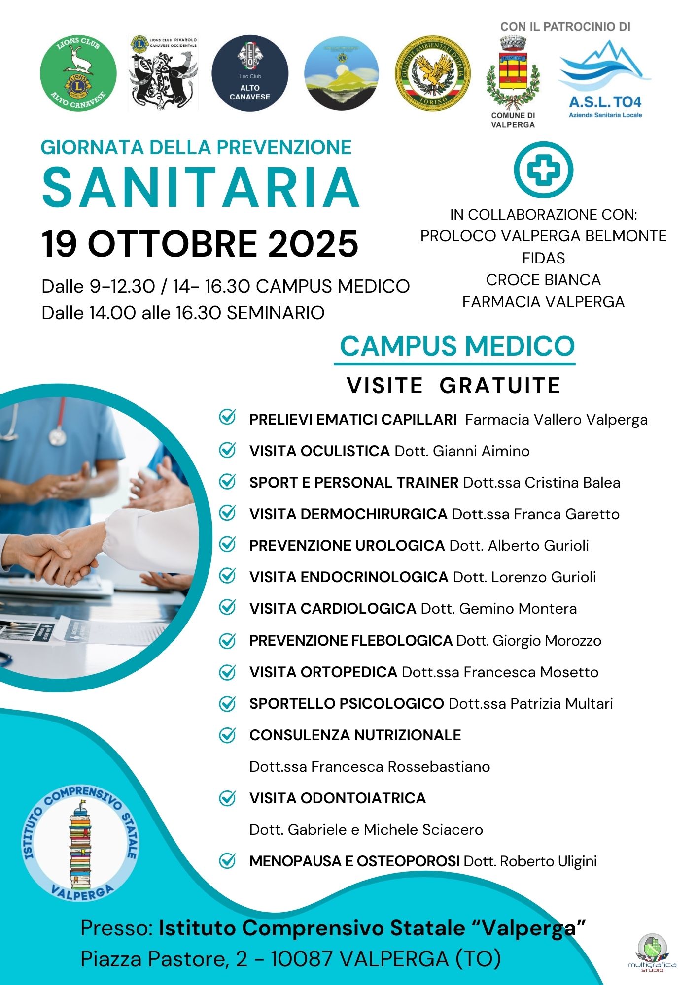 Il giorno 19 ottobre 2025 dalle ore 9.00 alle ore 12.30 e dalle 14.00 alle 16.30 CAMPUS MEDICO con VISITE GRATUITE presso l'Istituto Comprensivo di Valperga in Piazza Pastore n. 2.