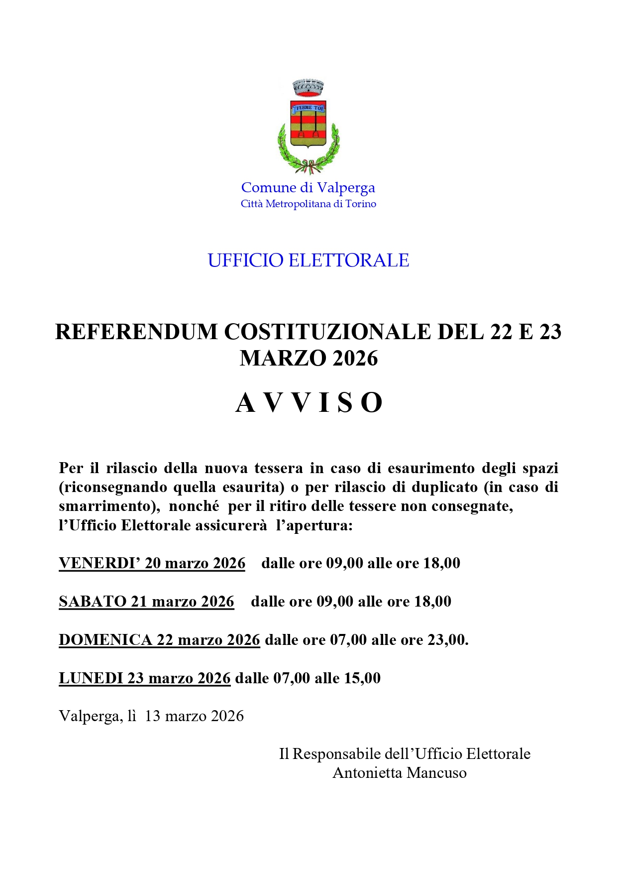 l’Ufficio Elettorale assicurerà l’apertura: