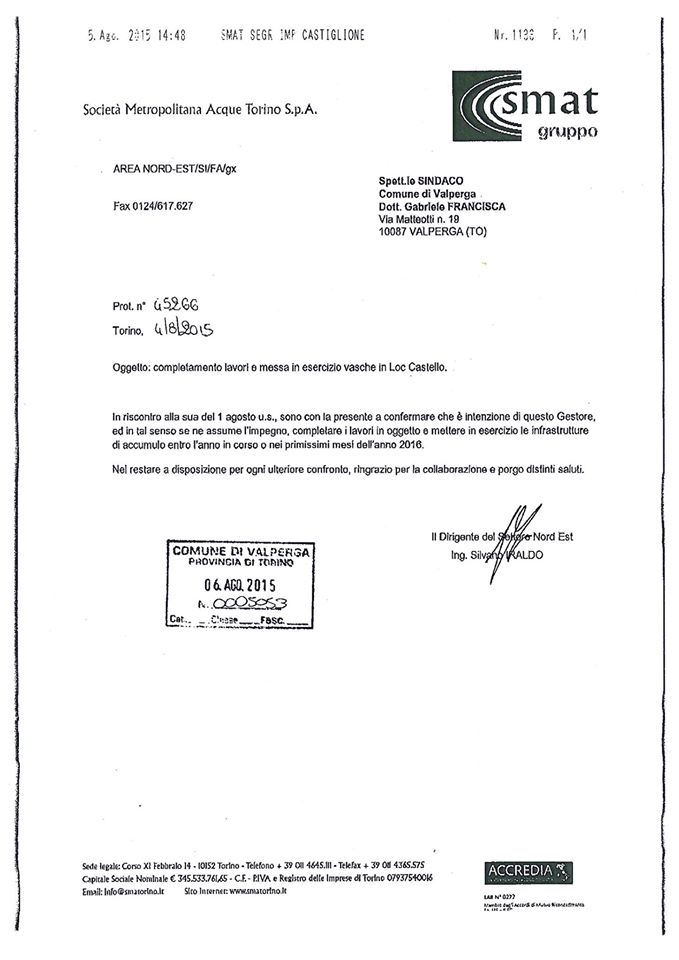 La SMAT si impegna a mettere in funzione la vasca ubicata in Loc. Castello e mai ultimata per la fine del 2015 o nei primi mesi del 2016