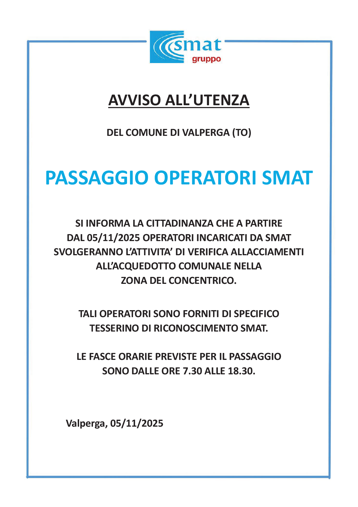 Passaggio operatori SMAT per verifica allacciamenti all'acquedotto comunale