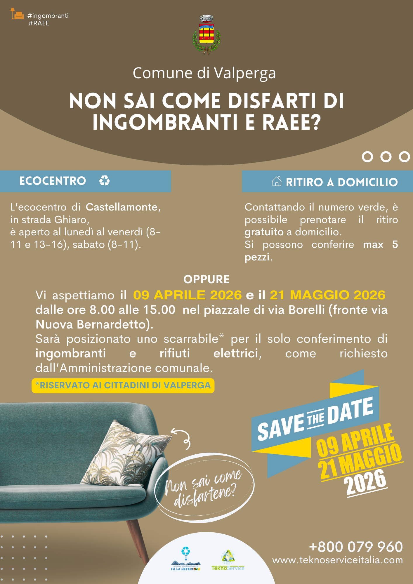 Contattando il NUMERO VERDE 800 079 960 è possibile prenotare il servizio GRATUITO di ritiro a DOMICILIO (massimo 5 pezzi).