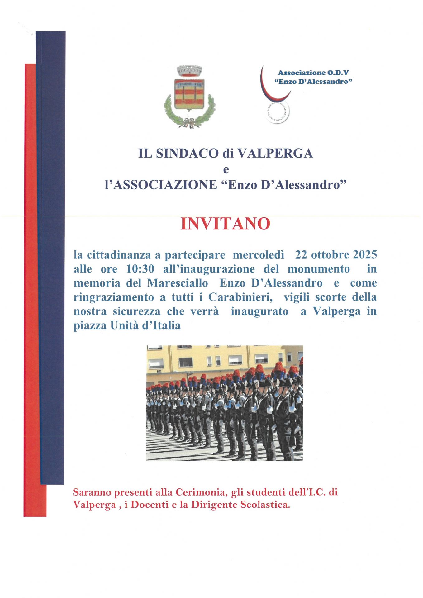 La Cittadinanza è invitata a partecipare il giorno mercoledi' 22 Ottobre 2025, all'inaugurazione che si terra' in Piazza Unita' d'Italia alle ore 10:30, del monumento in memoria del Maresciallo dell'Arma dei Carabinieri "Enzo d'Alessandro", tributo a tutti i Carabinieri d'Italia che vigilano per garantire la sicurezza dei cittadini.